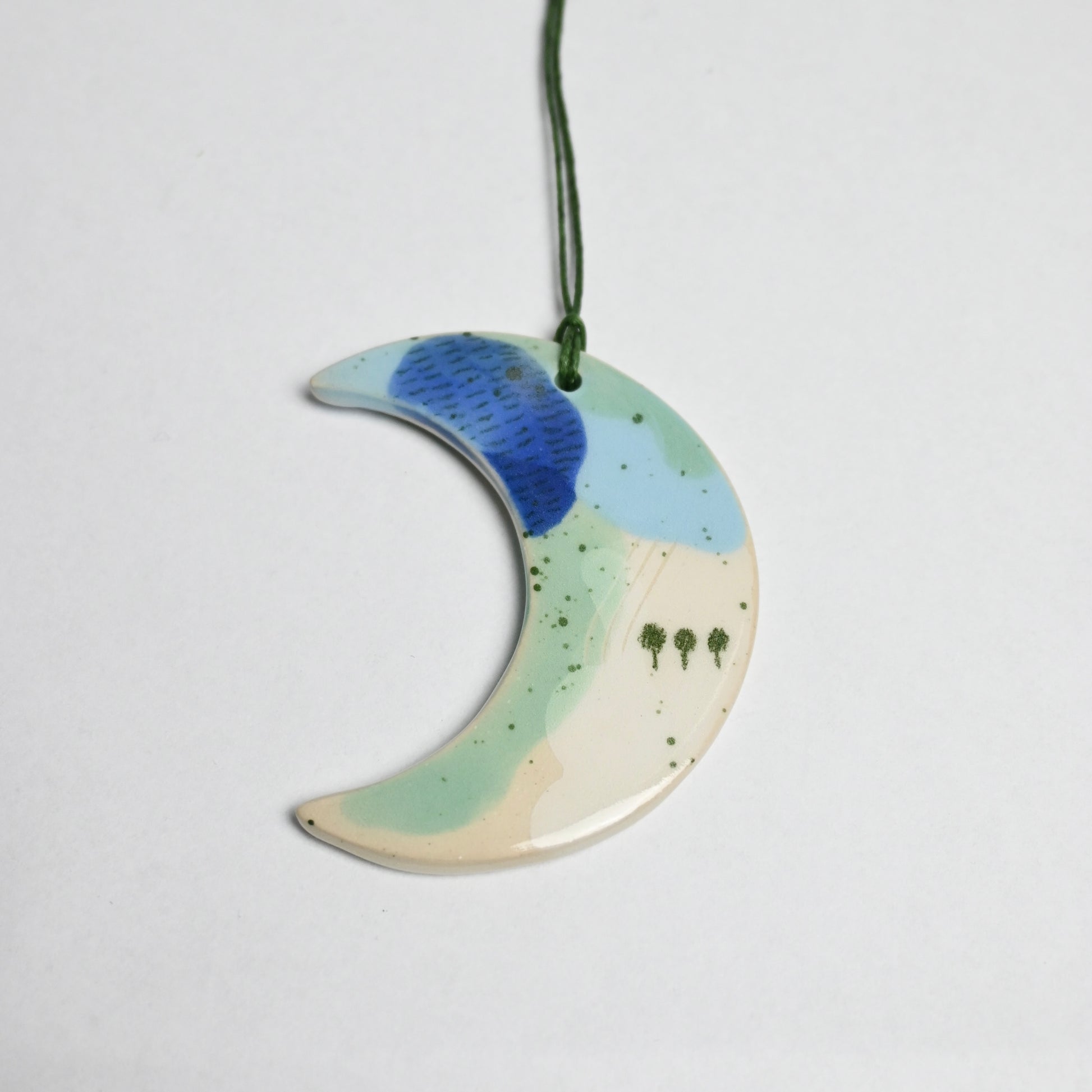 A beautiful handmade ceramic hanging decoration, by Made & Matter. Each decoration has been hand painted on both sides then coated in shiny transparent glaze on the front. Each moon is unique, no two are the same. The decorations go through 2 firings before they are complete.
