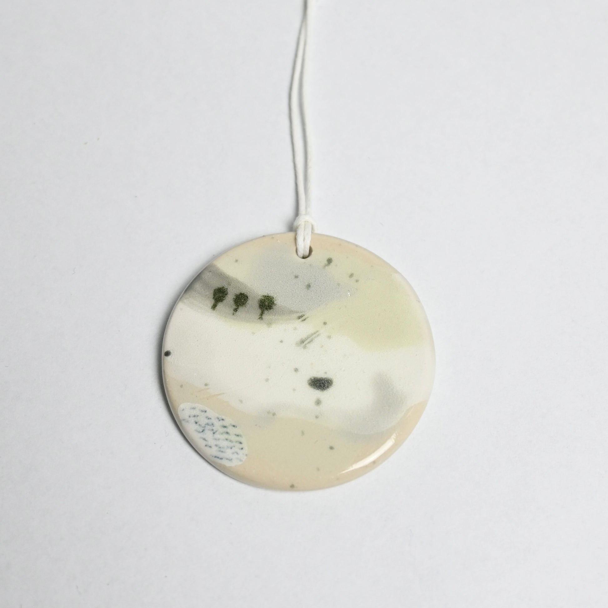 A beautiful handmade ceramic hanging decoration, by Made & Matter. Each decoration has been hand painted on both sides then coated in shiny transparent glaze on the front. Each disc is unique, no two are the same. The decorations go through 2 firings before they are complete.