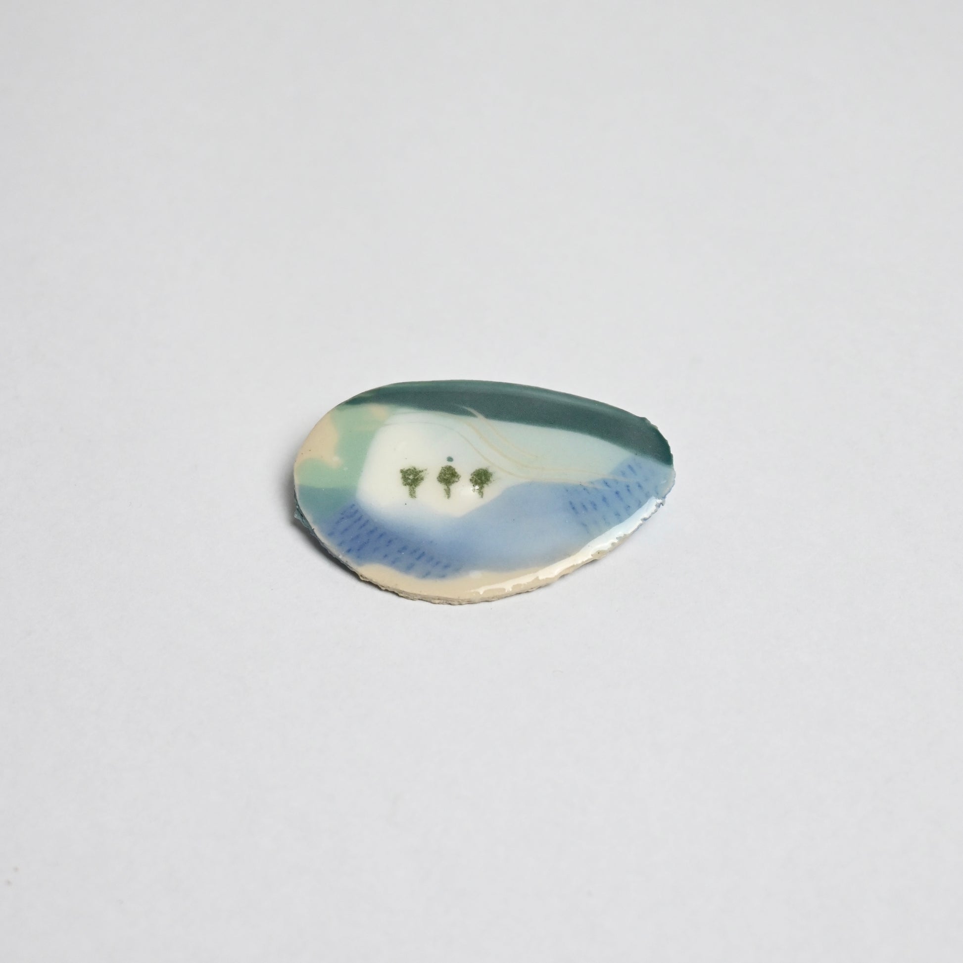 A unique ceramic brooch with a gold plated pin, by Made & Matter. Inspired by the beautiful coastal landscape of Anglesey. The changing tide and weather; alongside a backdrop of forests, fields and mountains provide endless inspiration and form the basis for the abstract and organic hand painted decoration, finished with a transparent glossy glaze.