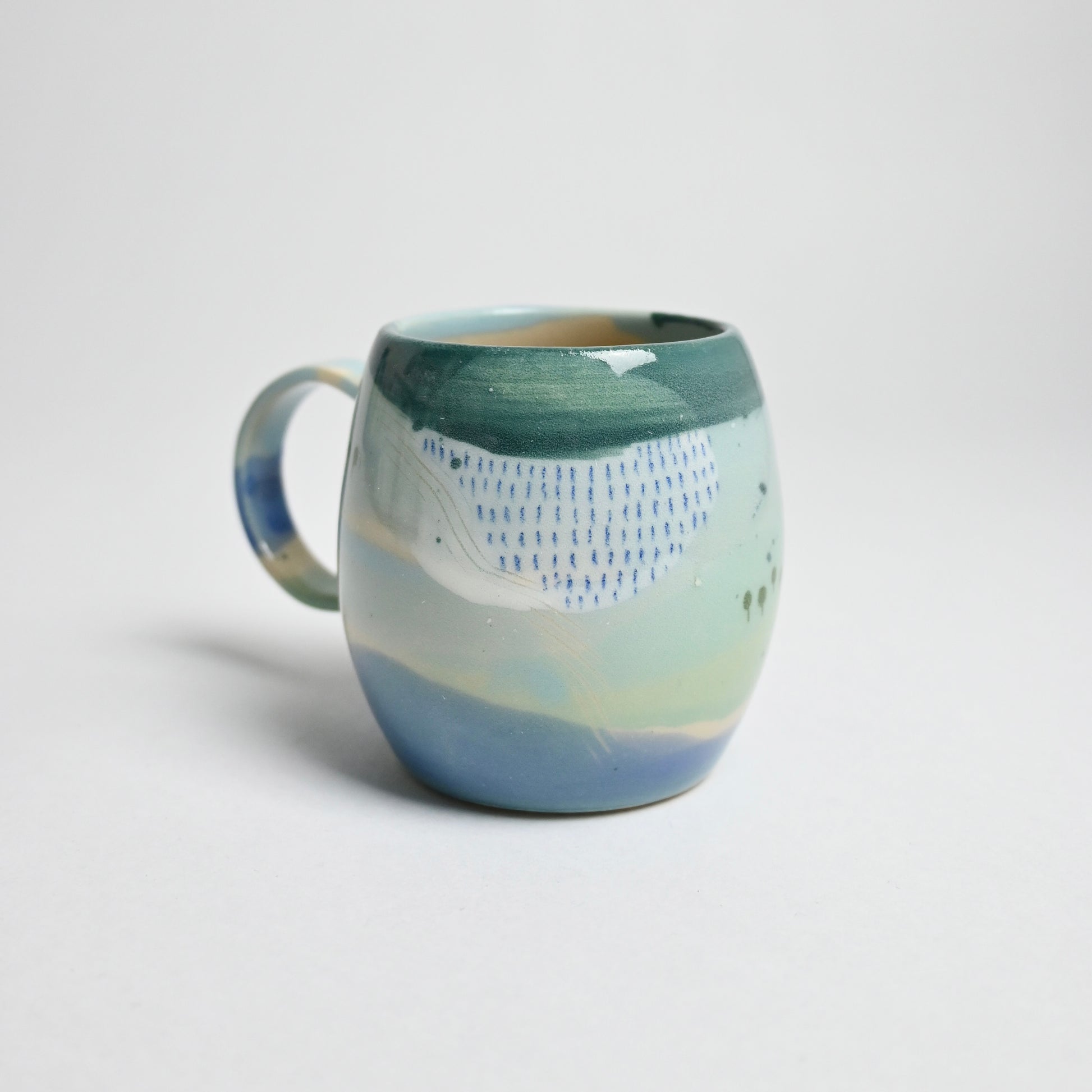 A unique ceramic mug by Made & Matter inspired by a beautiful coastal landscape of Anglesey. The changing tide and weather; alongside a backdrop of forests, fields and mountains provide endless inspiration and form the basis for the abstract and organic hand painted decoration, finished with a transparent glossy glaze.