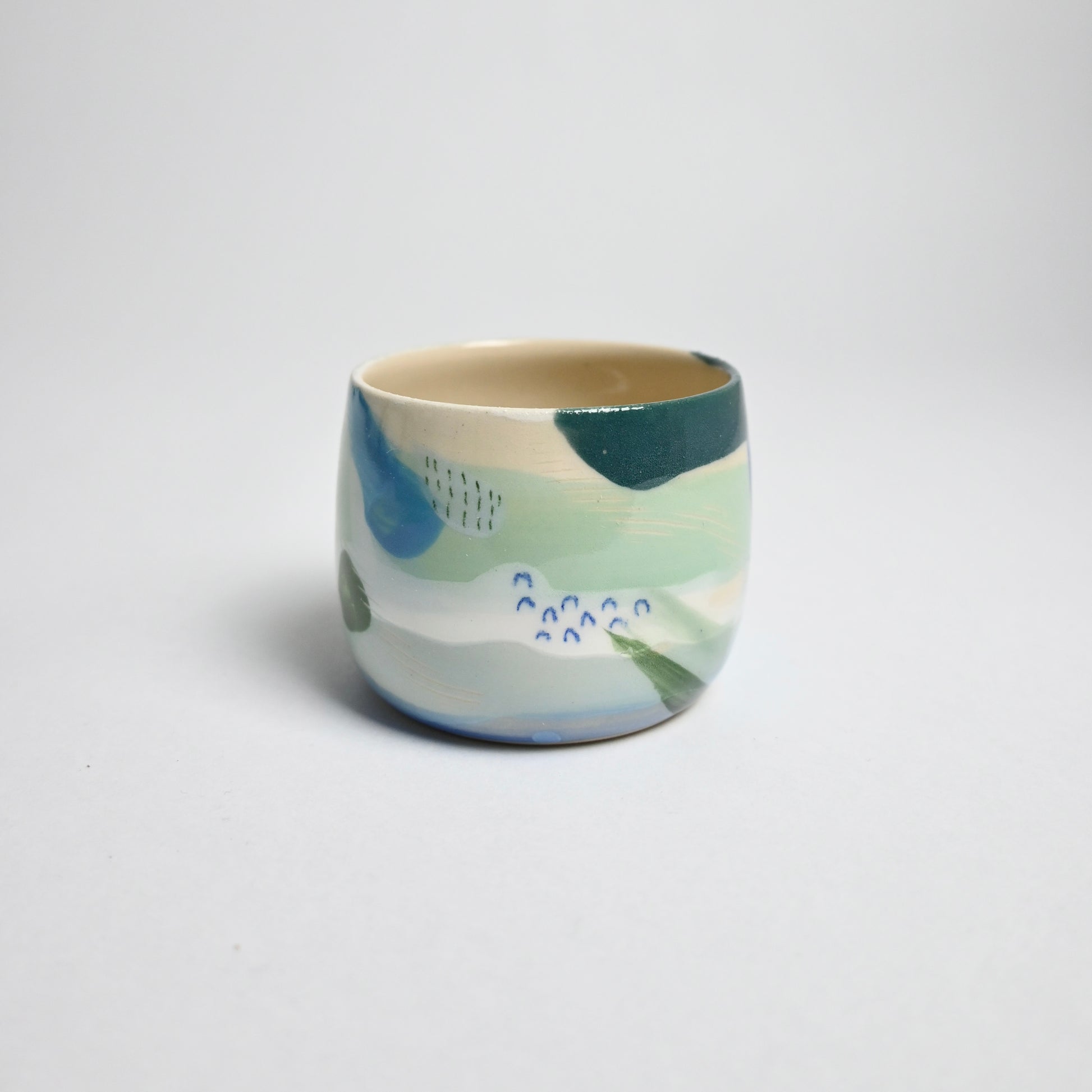 A unique ceramic cup suitable for warm or cold drinks by Made & Matter. It can also be used as a small plant pot or tea light holder. Inspired by the beautiful coastal landscape of Anglesey. The changing tide and weather; alongside a backdrop of forests, fields and mountains provide endless inspiration and form the basis for the abstract and organic hand painted decoration, finished with a transparent glossy glaze.