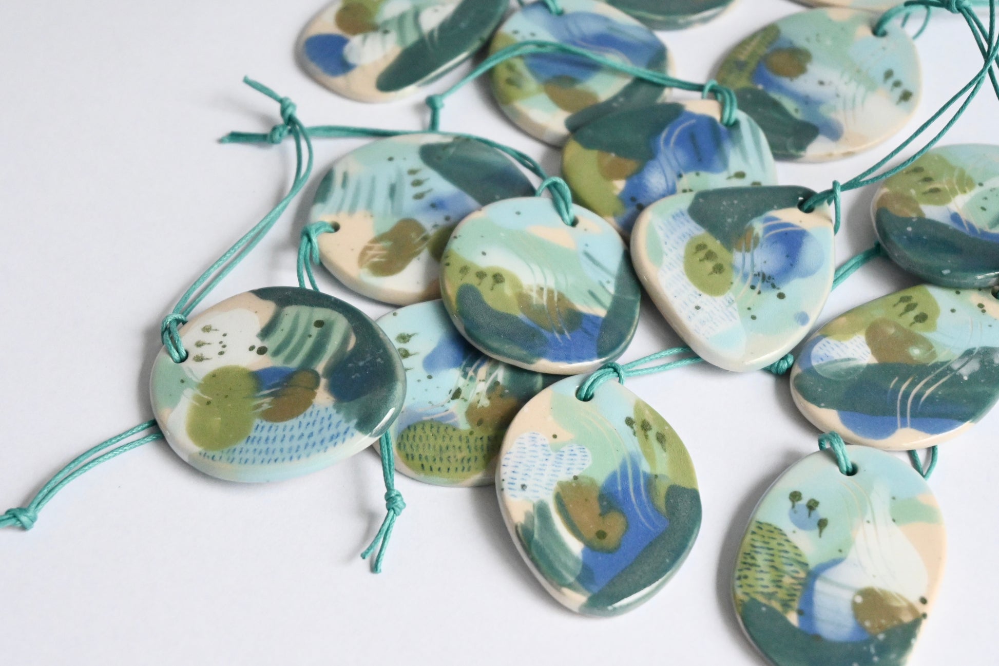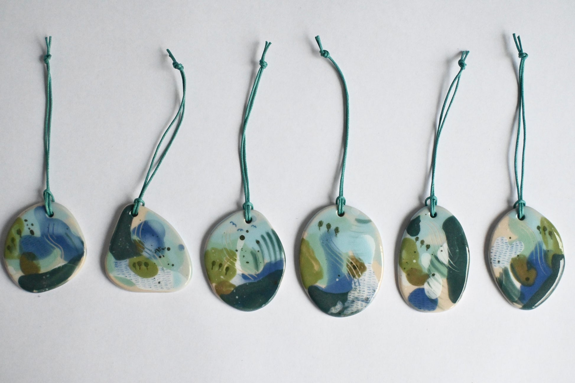 Each decoration has been hand painted in an abstract style, on both sides, then coated in shiny transparent glaze on the front. Each decoration is unique, no two are the same. The decorations go through 2 firings before they are complete.