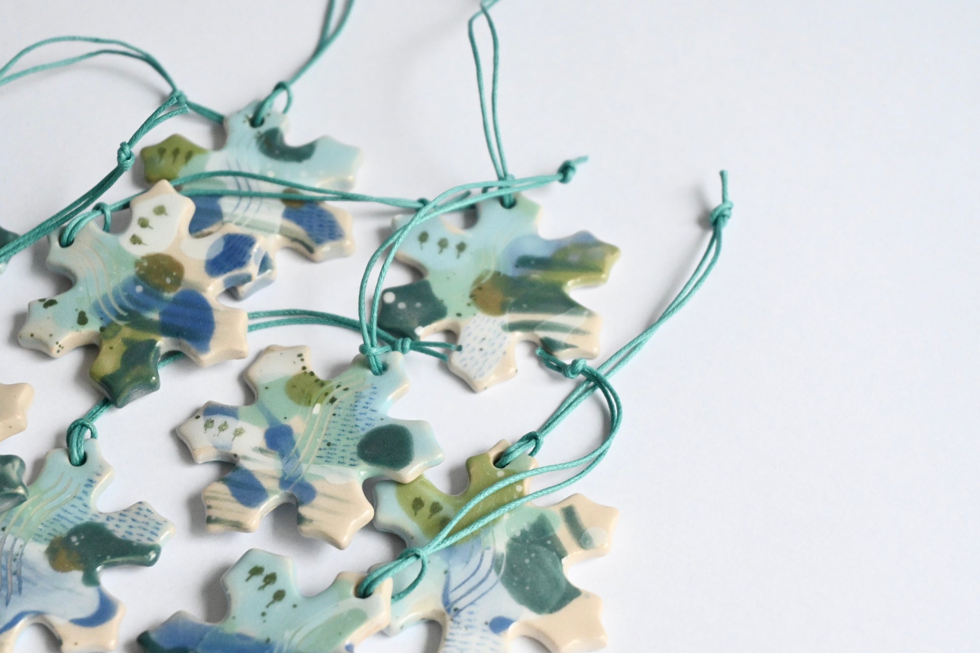 A beautiful handmade ceramic hanging decoration, by Made & Matter. Each decoration has been hand painted in an abstract style, on both sides, then coated in shiny transparent glaze on the front. Each snowflake is unique, no two are the same. The decorations go through 2 firings before they are complete.