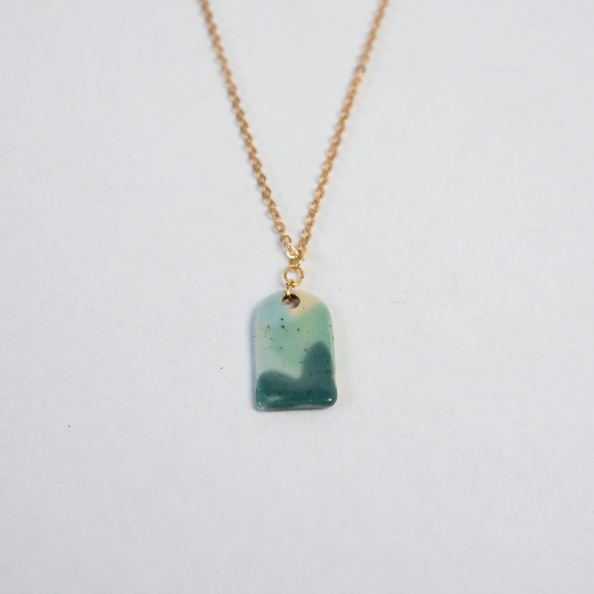 A unique necklace with a ceramic pendant on a gold plated chain by Made & Matter. Inspired by the beautiful coastal landscape of Anglesey. The changing tide and weather; alongside a backdrop of forests, fields and mountains provide endless inspiration and form the basis for the abstract and organic hand painted decoration, finished with a transparent glossy glaze.