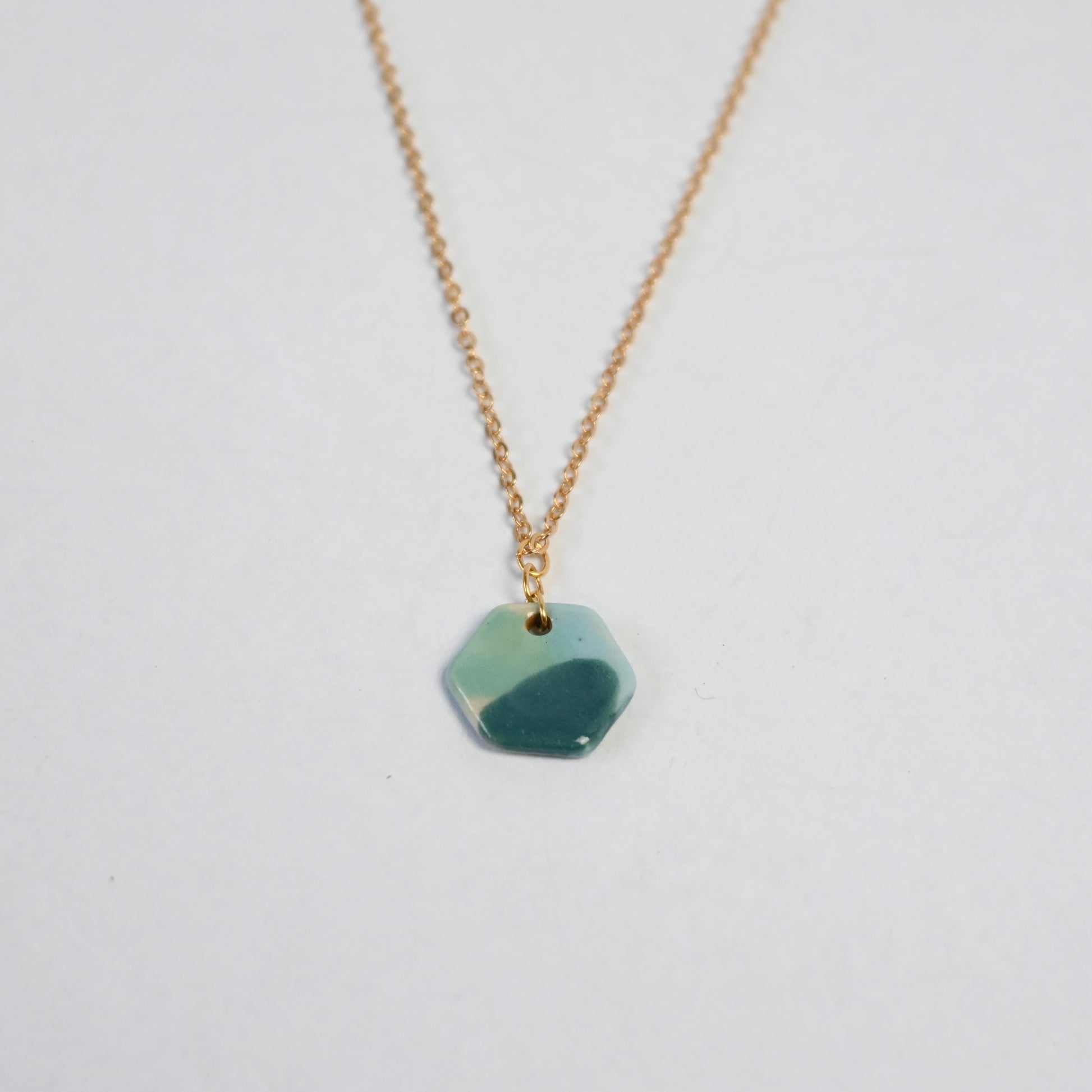 A unique necklace with a ceramic pendant on a gold plated chain by Made & Matter. Inspired by the beautiful coastal landscape of Anglesey. The changing tide and weather; alongside a backdrop of forests, fields and mountains provide endless inspiration and form the basis for the abstract and organic hand painted decoration, finished with a transparent glossy glaze.