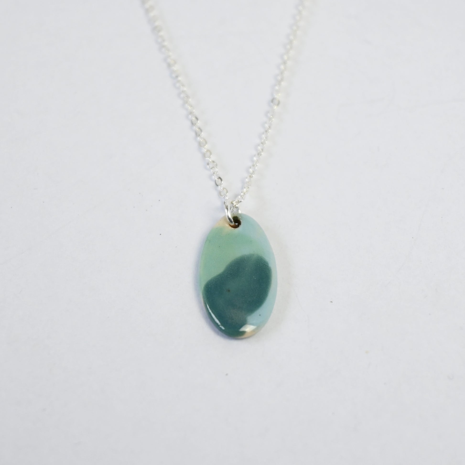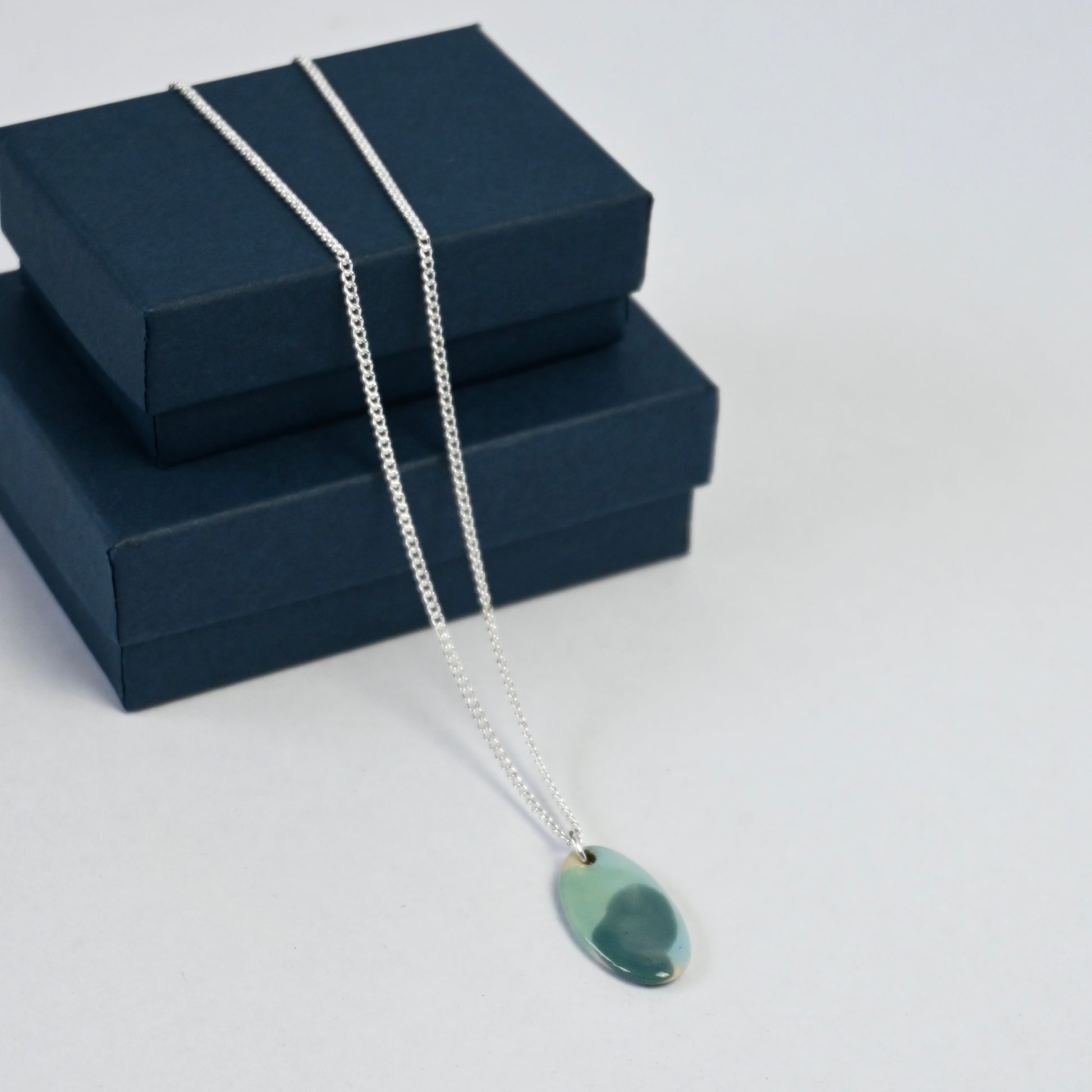 A unique necklace with a ceramic pendant on a silver plated chain by Made & Matter. Inspired by the beautiful coastal landscape of Anglesey. The changing tide and weather; alongside a backdrop of forests, fields and mountains provide endless inspiration and form the basis for the abstract and organic hand painted decoration, finished with a transparent glossy glaze.
