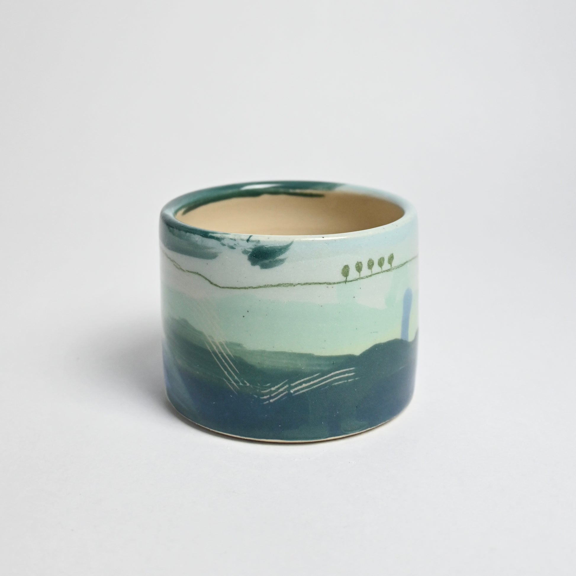 A unique ceramic pot by Made & Matter. Use for a succulent or plant, in the kitchen or for pens and other knick knacks. Inspired by the beautiful coastal landscape of Anglesey. The changing tide and weather; alongside a backdrop of forests, fields and mountains provide endless inspiration and form the basis for the abstract and organic hand painted decoration, finished with a transparent glossy glaze.