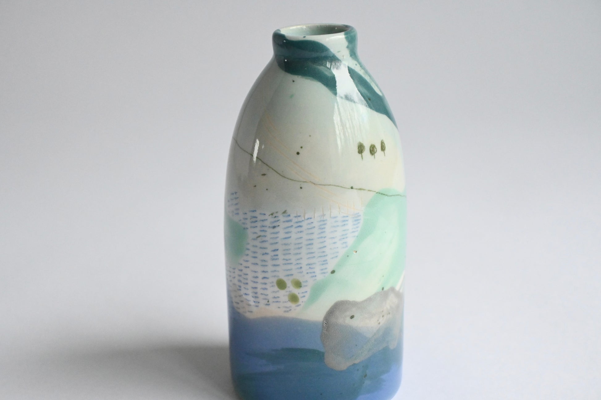 A unique ceramic vase by Made & Matter. Inspired by the beautiful coastal landscape of Anglesey. The changing tide and weather; alongside a backdrop of forests, fields and mountains provide endless inspiration and form the basis for the abstract and organic hand painted decoration, finished with a transparent glossy glaze.