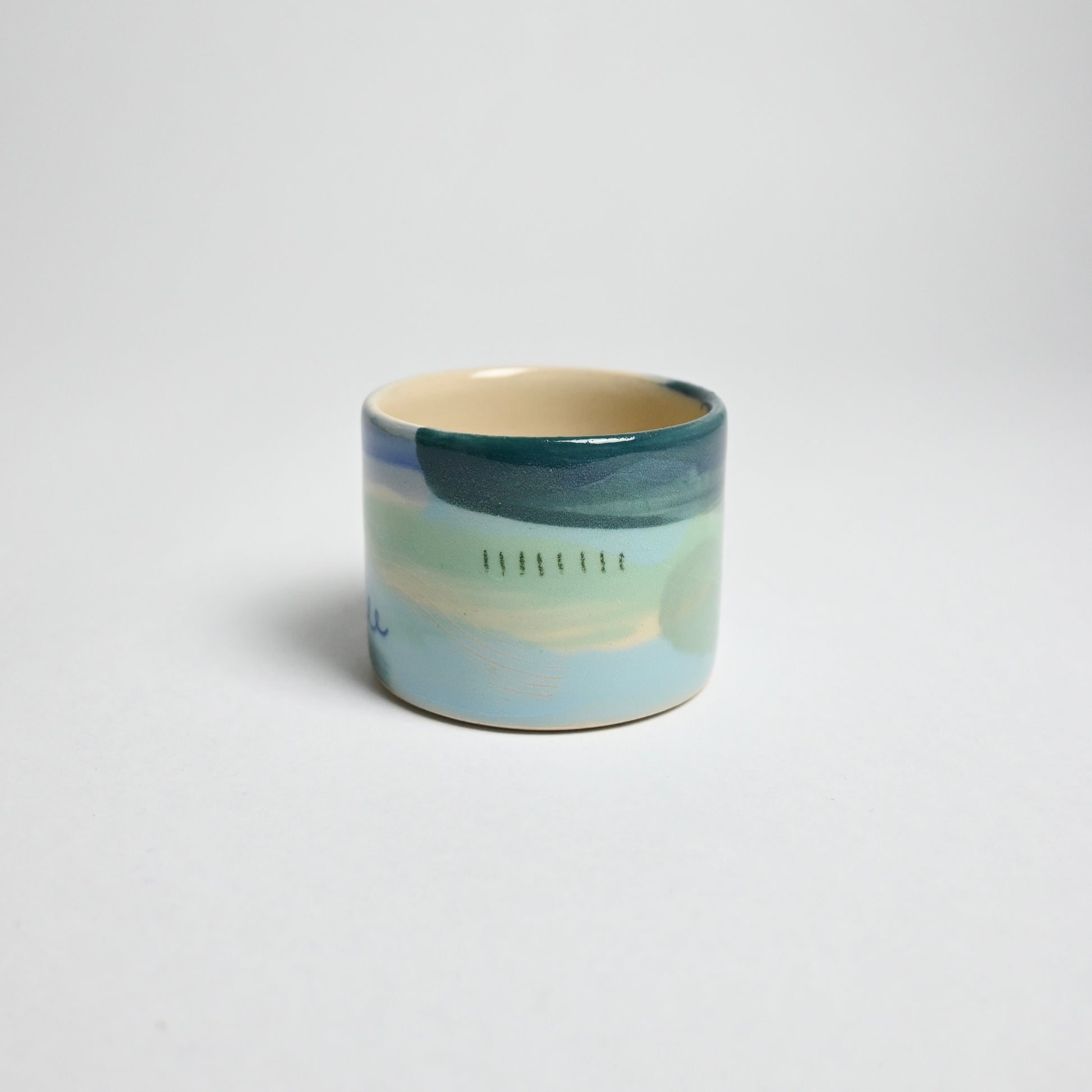 A unique ceramic cup suitable for warm or cold drinks by Made & Matter. It can also be used as a small plant pot or tea light holder. Inspired by the beautiful coastal landscape of Anglesey. The changing tide and weather; alongside a backdrop of forests, fields and mountains provide endless inspiration and form the basis for the abstract and organic hand painted decoration, finished with a transparent glossy glaze.