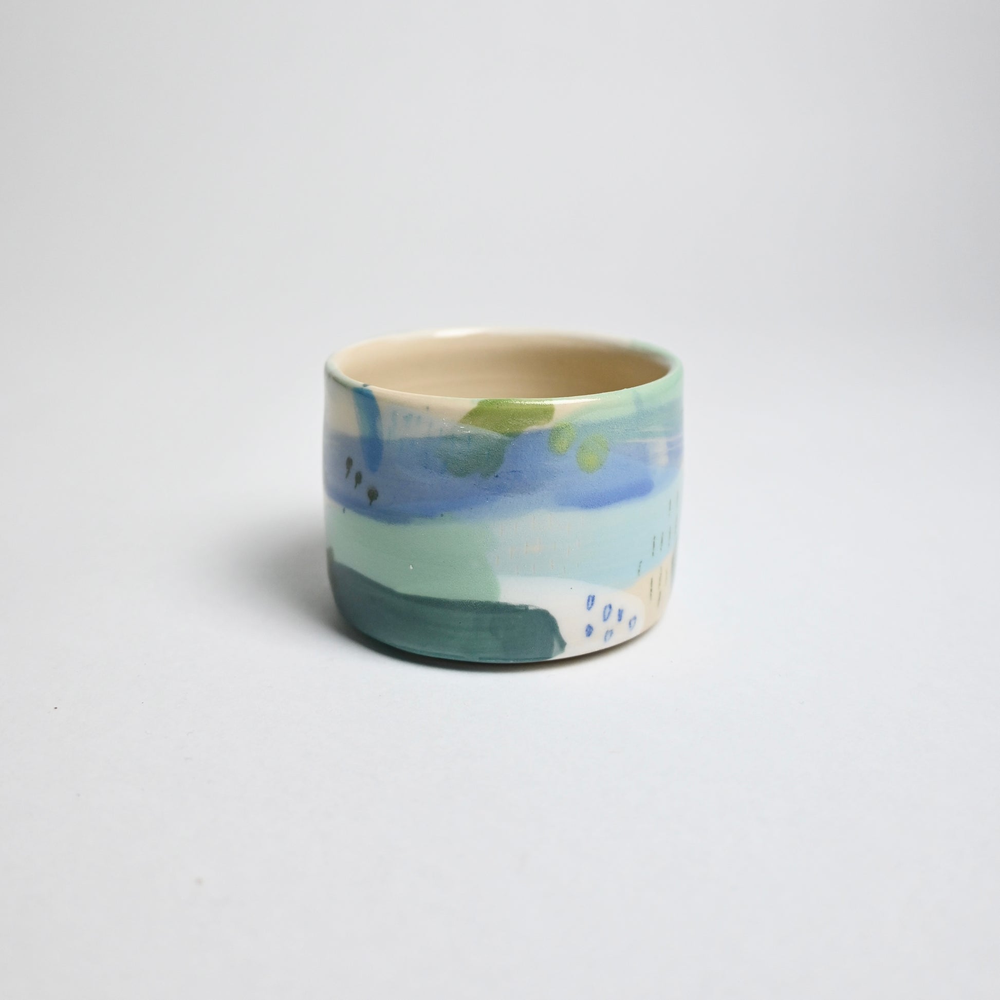 A unique ceramic cup suitable for warm or cold drinks by Made & Matter. It can also be used as a small plant pot or tea light holder. Inspired by the beautiful coastal landscape of Anglesey. The changing tide and weather; alongside a backdrop of forests, fields and mountains provide endless inspiration and form the basis for the abstract and organic hand painted decoration, finished with a transparent glossy glaze.