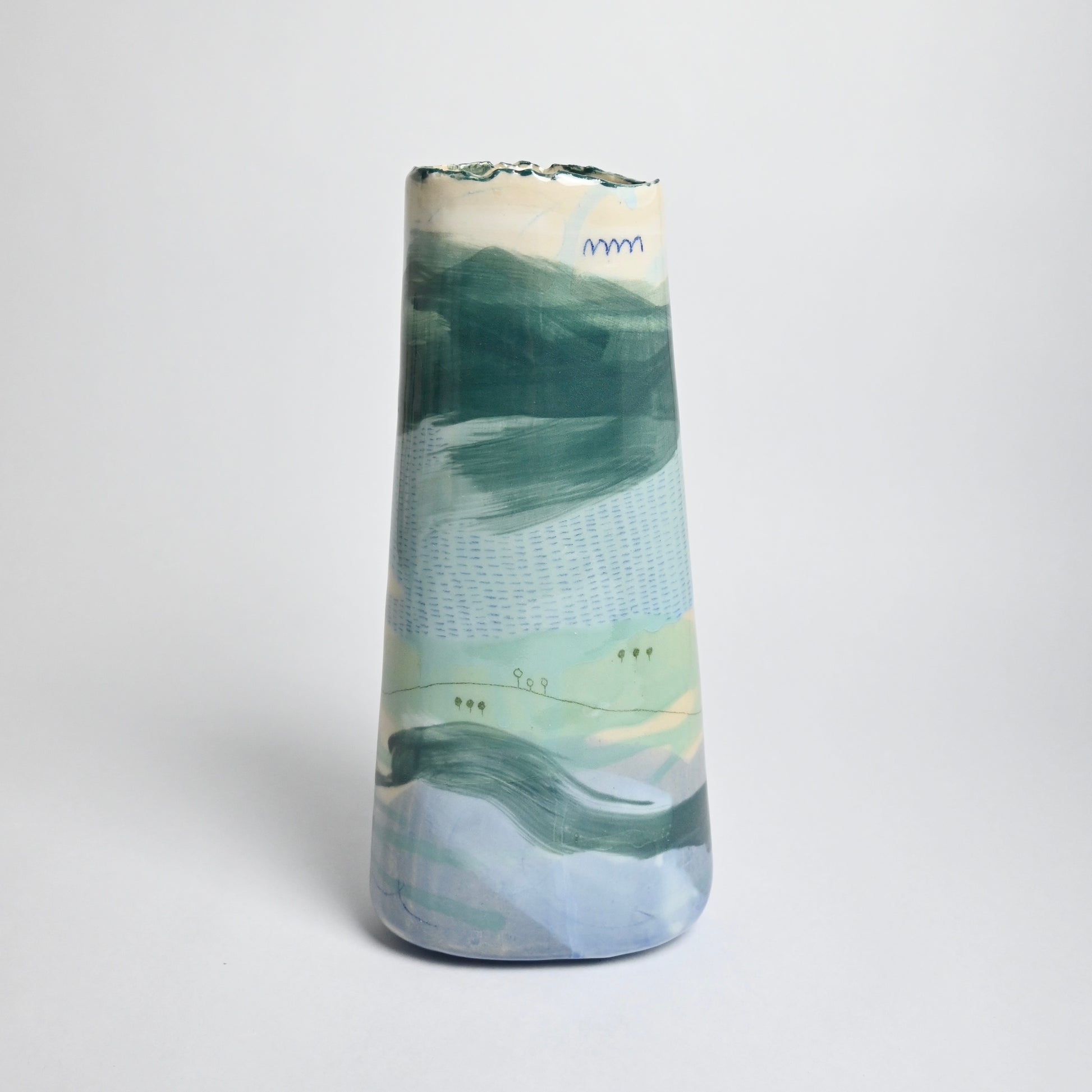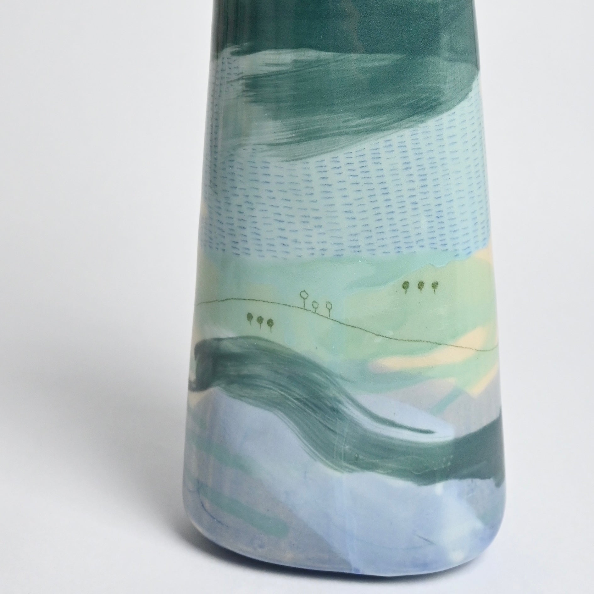 A unique ceramic vessel by Made & Matter. Inspired by the beautiful coastal landscape of Anglesey. The changing tide and weather; alongside a backdrop of forests, fields and mountains provide endless inspiration and form the basis for the abstract and organic hand painted decoration, finished with a transparent glossy glaze.